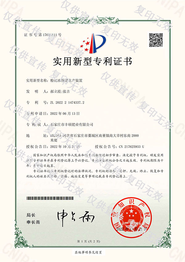 石家莊市豐碩肥業有限公司是一家集新型肥料的研發、制造、營銷、服務于一體的高新技術企業,公司自2008年創辦以來,一直致力于新型肥料的技術研發和市場推廣。公司組建了豐碩新型肥料研究中心(院士專家企業工作站),自主知識產權研發團隊專業科研人員20余人,獲得了多項肥料國家發明專利。公司目前已擁有發酵類有機肥、微生物菌劑、生物有機肥、土壤調理劑、大量元素水溶肥、含腐植酸肥料、含氨基酸肥料、中微量元素肥料等8大品類,“金維克”、“豐碩沃農”等2大自有品牌,擁有20多個暢銷品種。目前,我公司已經通過了“ISO9001 質量管理體系認證”、“ISO14001 環境管理體系認證”、“OHSAS18001 職業健康管理體系認證”。...